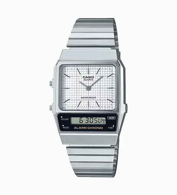 Reboot your retro vintage style with a contemporary update on the 1980s AQ-450 design. This brand-new vintage style watch is a beautiful blend of retro and stylish. A separate dial and LCD serve up analog beauty alongside digital performance. The LCD angles gently to follow the lines of the lugs, while the analog dial features simple bar index marks. The watch face adorned in a grid pattern adds the final touch for a real retro feel. The combination of the angular case and the straight links of the metal band is a simple and stylish celebration of structural beauty. More than just a fashion statement, these timepieces deliver practical functions like dual time, stopwatch, and alarm, as well as water resistance for daily use to free you from worry, even on rainy days.