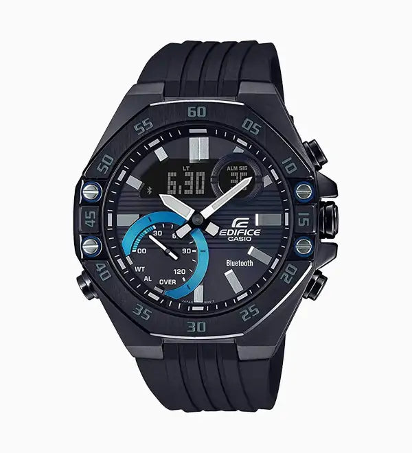 ECB-10 Series timepieces were developed in consultation with racing team members. They use Bluetooth® to link with a smartphone for minute-by-minute coordination of daily schedules among team members, and Auto Time Zone updating that ensures timekeeping is current and accurate no matter where in the world you happen to be.
