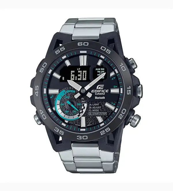 Introducing true motorsports form, functionality, and sophistication — the EDIFICE SOSPENSIONE ECB-40, with carbon fiber reinforced resin suspension arm design and Smartphone Link. The unique case design is inspired by formula car suspension with lugs configured in a four-arm arrangement, two above and two below. Carbon fiber-reinforced resin delivers a case that is lightweight, yet strong. Thanks to Smartphone Link, this special timepiece automatically connects when within range of a paired smartphone. Tap into the app to access functions that are so important for racing teams — get automatically adjusted to-the-second precision timekeeping, effortlessly manage world time, and transfer stopwatch data measured to the millisecond for up to 200 lap times to your smartphone. The Super Illuminator high-luminosity double LED illuminates the digital-analog display for easy readability, even in the dark.