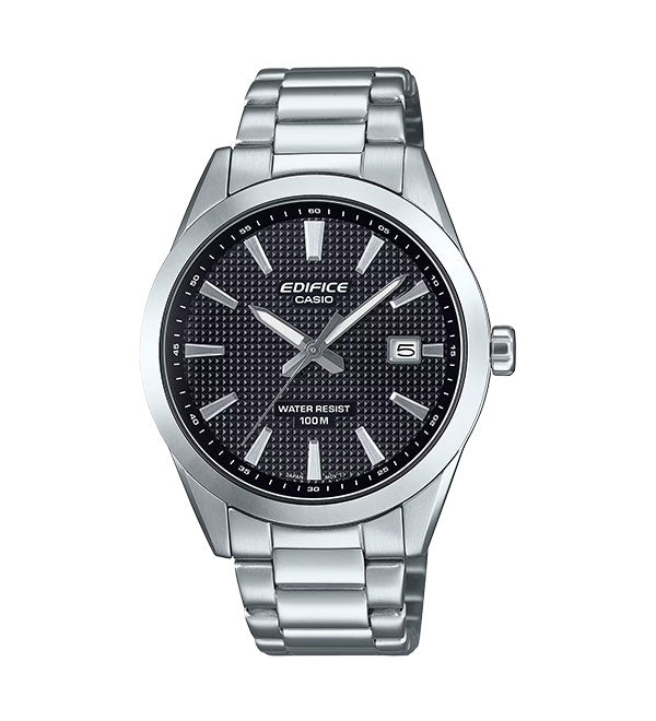 View compareIntroducing an EDIFICE for motorsports fans and car enthusiasts — a refined timepiece sporting the legendary Clous de Paris pattern. The EFV-160D dial features a three-hand layout with a date display, complemented by the striking sophistication of the Clous de Paris raised pyramid pattern. With a 40 mm stainless-steel case and new band shape, this timepiece delivers a natural fit for all-day comfort. The glass is slightly curved for even better visibility, while 100-meter water resistance leaves you to focus on more exciting things. Functional and stylish — an EDIFICE that makes life that much sweeter.