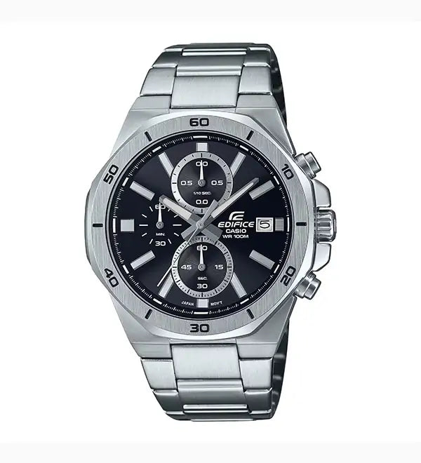 Analog: 3 hands (hour, minute, second), 3 dials (stopwatch 1/10 seconds, stopwatch minutes, stopwatch seconds)