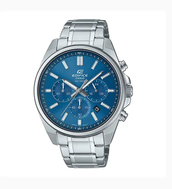 Strike just the right chord with a mid-sized classic EDIFICE chronograph. The sophisticated pairing of fine detail and design features a thin bezel offset by a wide dial for striking, elegant style.