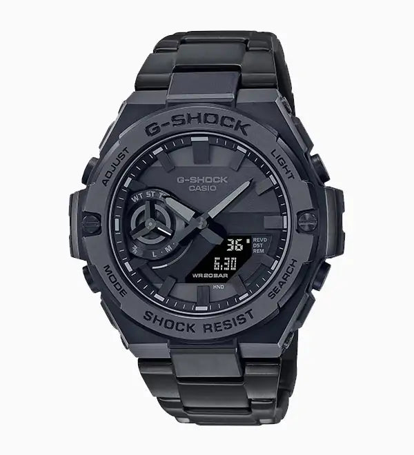 The GST-B500 line brings together smaller components and high-density mounting, continuing to deliver Bluetooth connectivity and solar power charging, but in an even slimmer profile. The Carbon Core Guard absorbs external shocks for true G-STEEL toughness, and the comfortable fit complements your unique way of life. Downsized button guards offer slim yet ample buttons that are easy to operate. The bezel is treated with multiple finishes to deliver exceptional metal textures from every angle, for a truly sophisticated presentation with its own special look