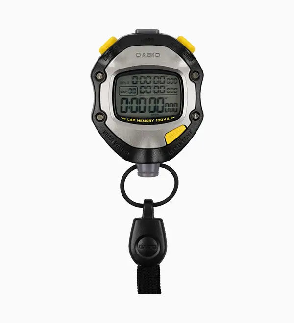 - 1/1000-second stopwatch Measuring capacity: Total elapsed time display: 9:59’59.999’’ Lap time display: 59’59.999’’ Split time display: 9:59’59.999’’ Measuring modes: Elapsed time, lap time, split time, 1st-100th place time, lap counter (up to 99) Memory capacity: 2 sets of 100 records each