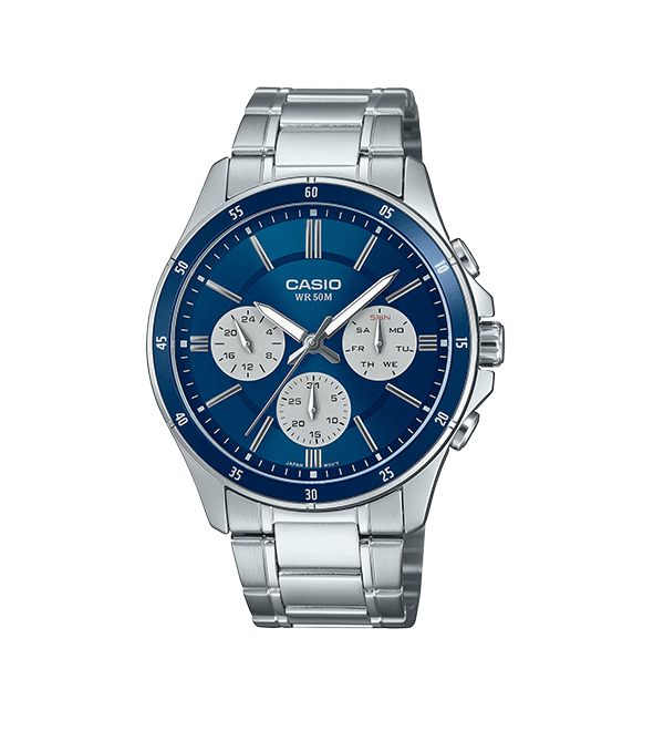A metal analog watch with a cool, sporty design. Water resistant up to 50 meters for peace of mind, even on rainy days.