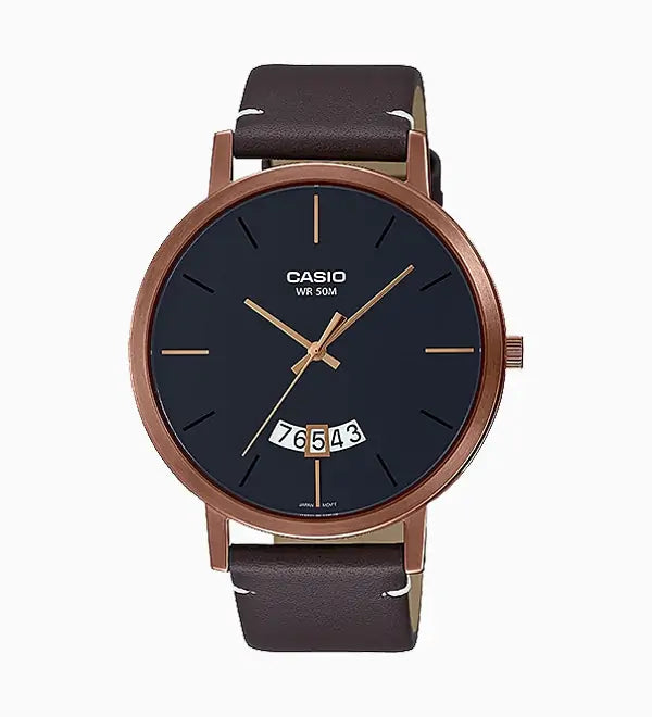 The classic timepiece — Casio’s traditional analog line, featuring the popular minimal design with a special calendar insetsophisticated touch. A slim date window floating between the 5 o’clock and 7 o’clock positions accents the sleek & simple watch face, which is very easy to read. With water resistance up to 50 meters, these watches stand up to everything you do in daily life, whether you’re on or off the clock. Your choice: the classic stainless steel band model; one of the stylish, easily adjustable mesh band models; or one of the genuine leather band models, for a more casual look.