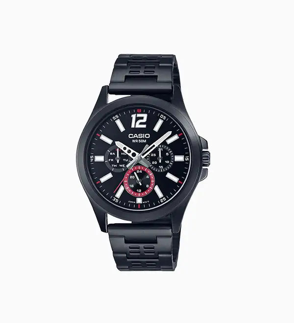 Regular timekeeping: Analog: 3 hands (hour, minute, second), 3 dials (date, day, 24-hour)