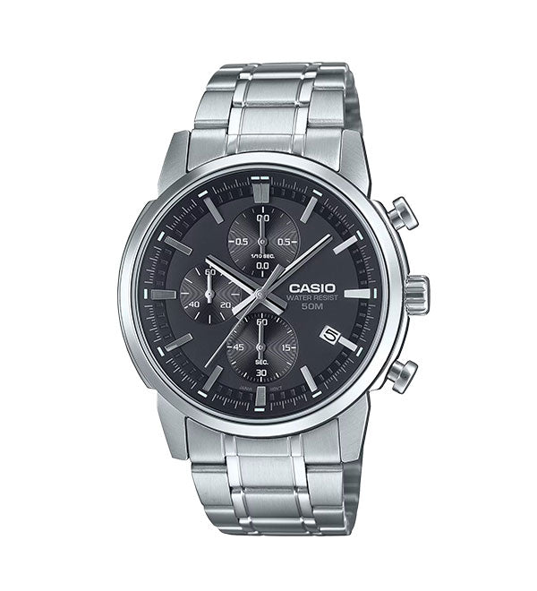 Analog: 3 hands (hour, minute, second), 3 dials (stopwatch 1/10 seconds, stopwatch minutes, stopwatch seconds)