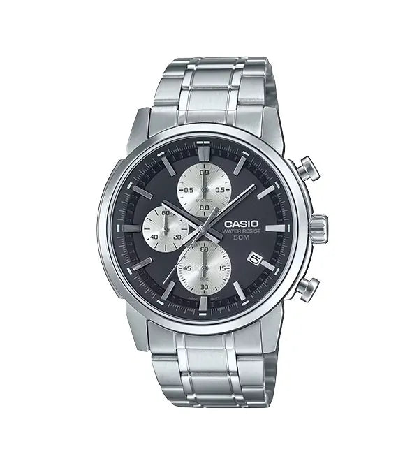 Analog: 3 hands (hour, minute, second), 3 dials (stopwatch 1/10 seconds, stopwatch minutes, stopwatch seconds)